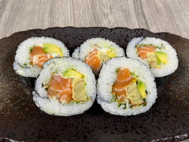 Futomaki saumon saumon BIOSaumon/avocat/omelette sucrée/poireaux/sésames5 pièces