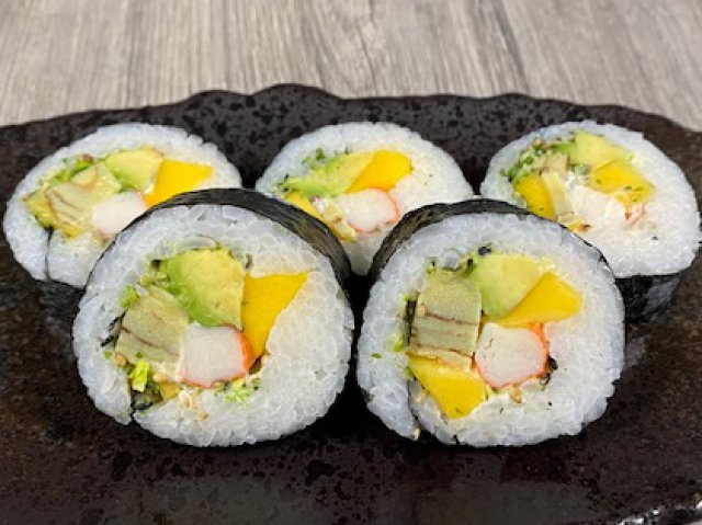 California roll surimi / mangue 🥭 / avocat 🥑/ mayonnaise 2 pièces.Gluten 🌾